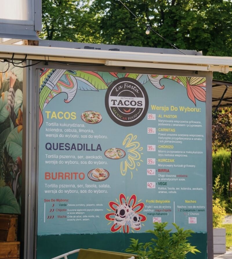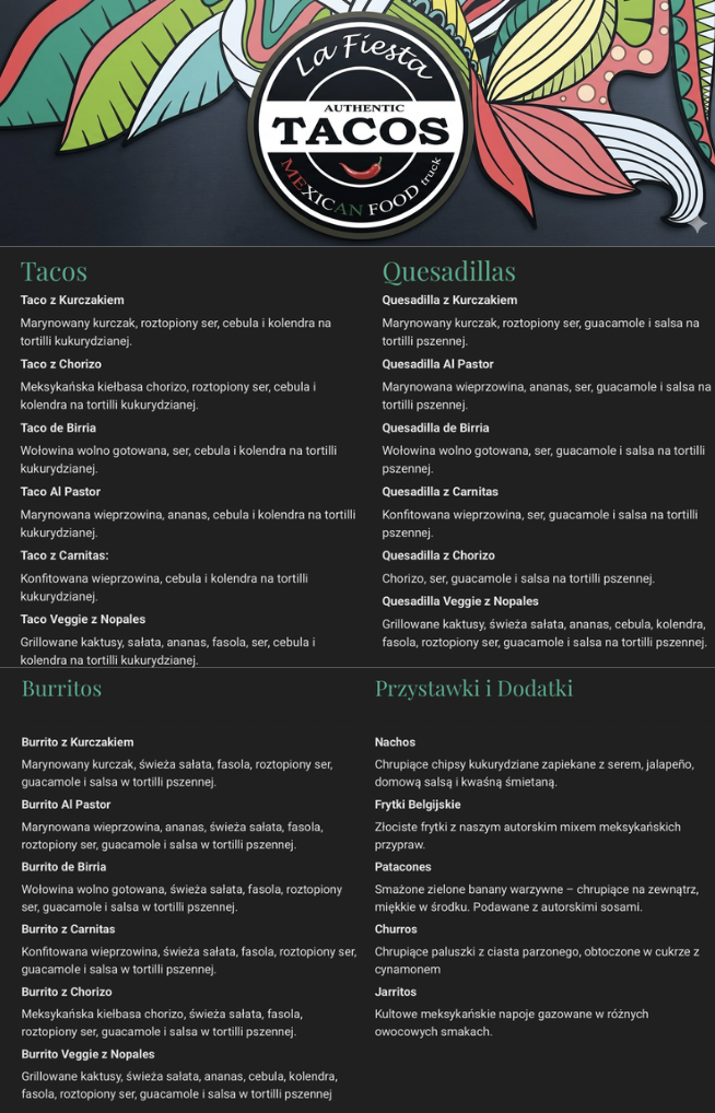 Co nas wyróżnia? Przede wszystkim bezkompromisowe podejście do tradycji. Naszą bazą jest 100% kukurydziana tortilla, domowe salsy oraz oryginalne receptury, które czerpią z bogatej kultury Mexico City. Nasze menu stale ewoluuje – od kultowych tacos al pastor, przez sycące burrito, aż po aromatyczne quesadille. Ale Tacos La Fiesta to coś więcej niż jedzenie "na wynos". To dynamiczna marka, która obecnie dysponuje flotą trzech stylowych Food Trucków. Dzięki temu jesteśmy w stanie obsłużyć każde wydarzenie – od kameralnych imprez prywatnych, przez festiwale, aż po duże eventy korporacyjne w całej Polsce.